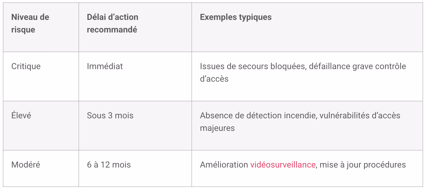 La hiérarchisation est essentielle. Certains risques exigent une action immédiate, d’autres peuvent être traités à moyen terme. Nous établissons systématiquement un classement selon la matrice impact/probabilité, permettant d’identifier clairement les priorités.